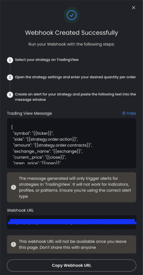 4. Once you click confirm, you will see a message and a Webhook URL in a new popup. Copy the message using the copy button.