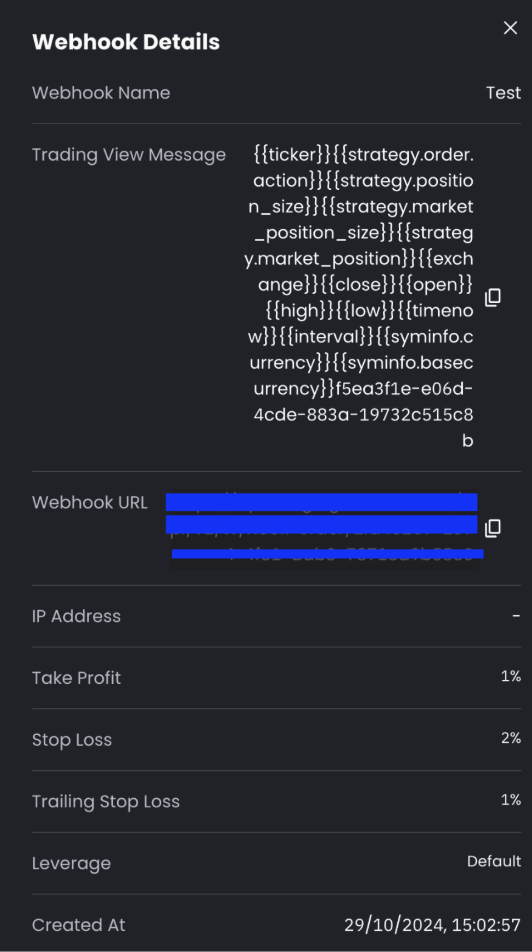 - IP Address (optional): Provide the IP address to make this webhook work for the specified IP address only. You can leave it blank if there is no specific requirement. The trading view IP addresses are already whitelisted and do not require any further addition over the same.